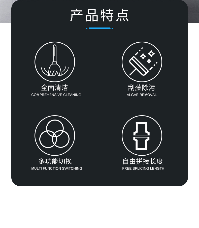 ● 擺動式清潔刷頭,方便不同角度清除污垢及青苔。