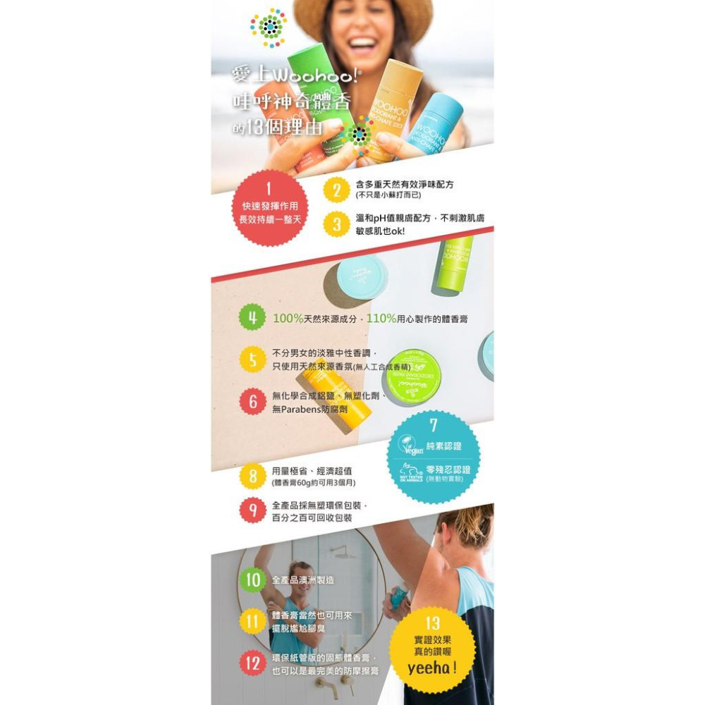 此外,WOOHOO體香棒也很適合作為運動或日常最實用的防摩擦膏,幫助減少因運動或衣服、鞋類等與皮膚相互摩擦所造成的刺激或不適(多部位適用:頸部、乳頭、腋下、鼠蹊部、雙腳...),形成一道有效、舒適、隱形的保護層!