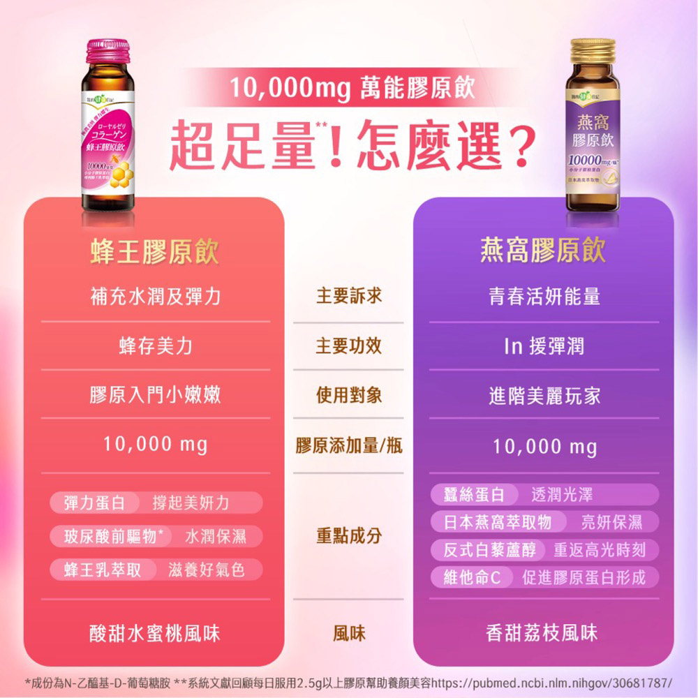 ◉10,000毫克小分子膠原蛋白 ◉2000道爾頓,分子小好吸收 ◉搭配日本專利蜂王乳與維他命C