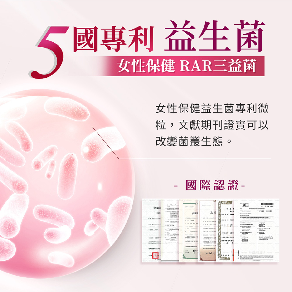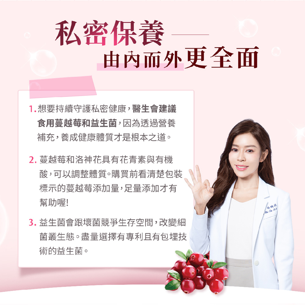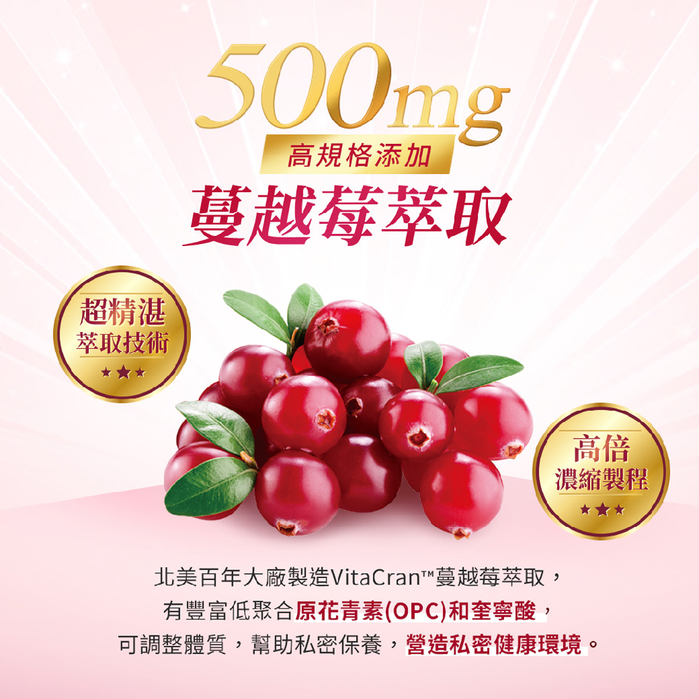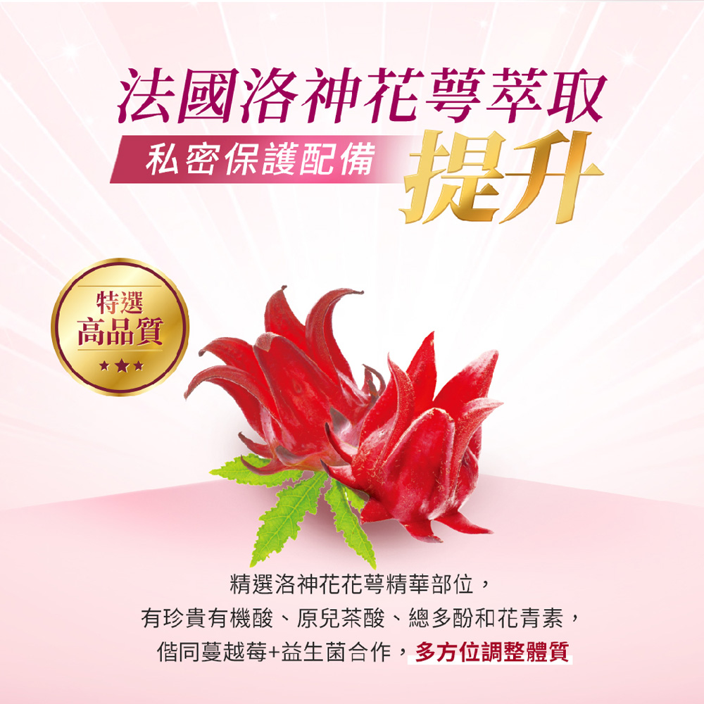 ◉3重守護極淨舒爽好自在 ◉蔓越莓萃取,五國專利益生菌 ◉法國洛神花萼萃取