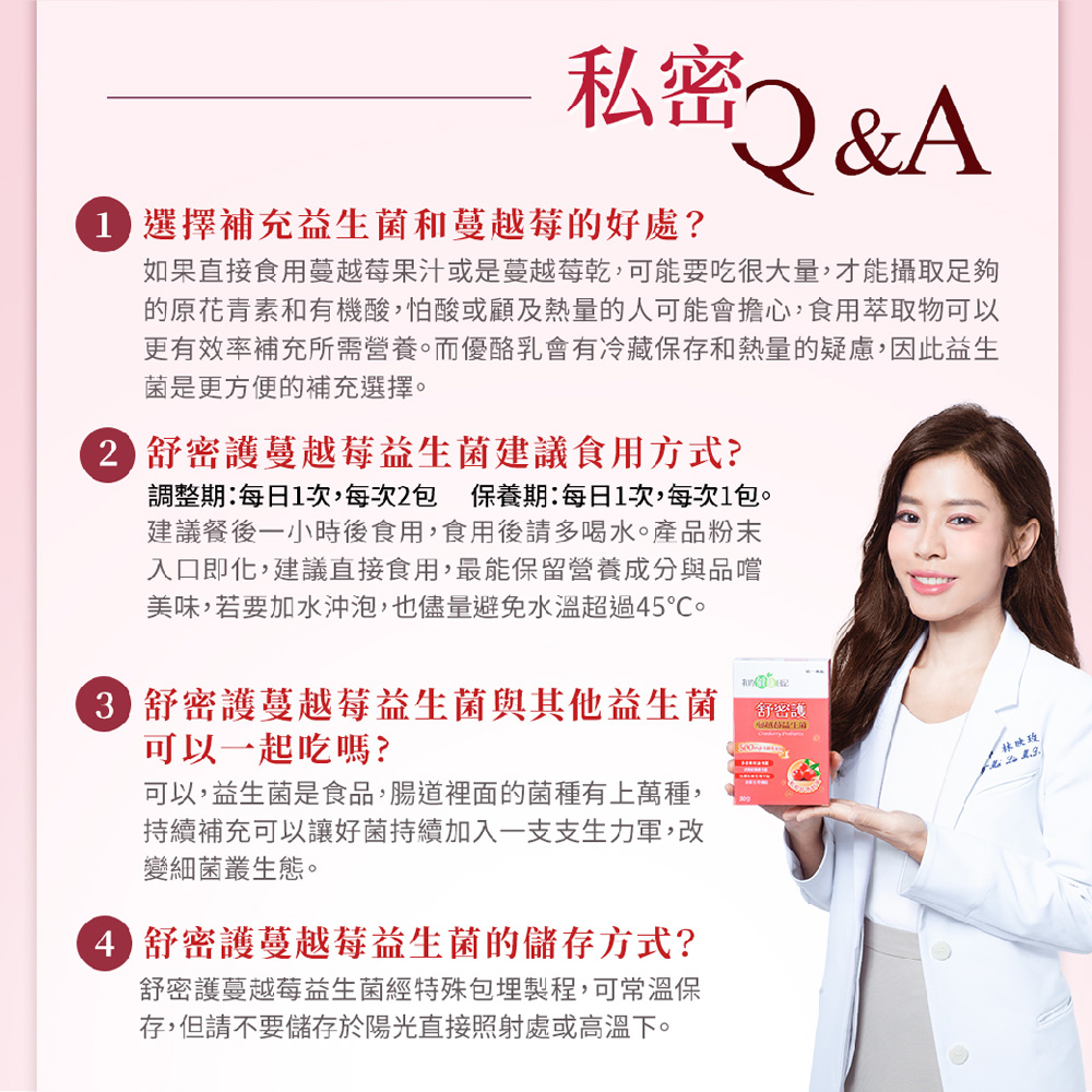商品全成份無水葡萄糖、玉米澱粉、蔓越莓萃取粉(蔓越莓、麥芽糊精、玉米澱粉、卵磷脂)、蔓越莓果汁粉{砂糖、蔓越莓果汁粉(麥芽糊精、蔓越莓濃縮汁、葡萄汁色素、辛烯基丁二酸鈉澱粉、黑加侖濃縮汁)、辛烯基丁二酸鈉澱粉、檸檬酸、檸檬酸鈉、玉米澱粉、蘋果酸、蔓越莓香料粉(辛烯基丁二酸鈉澱粉、麥芽糊精、蔓越莓香料、脂肪酸甘油酯、維生素E(抗氧化劑))、β-胡蘿蔔素(麥芽糊精、阿拉伯膠、中鏈三酸甘油酯、蔗糖、L-抗壞血酸鈉(抗氧化劑)、β-胡蘿蔔素、二氧化矽、生育醇(維生素E)(抗氧化劑))、胭脂紅}、麥芽糊精、鼠李糖乳桿菌Lactobacillus rhamnosus、L-抗壞血酸鈉(維生素C鈉鹽)、二氧化矽、嗜酸乳桿菌Lactobacillus acidophilus、蔓越莓香料{麥芽糊精、辛烯基丁二酸鈉澱粉、蔓越莓香料(香料、丙二醇)、脂肪酸甘油酯、維生素E(抗氧化劑) }、羅伊氏乳桿菌Lactobacillus reuteri、洛神花萼萃取(洛神花萼萃取、碳酸鈣)、木寡醣