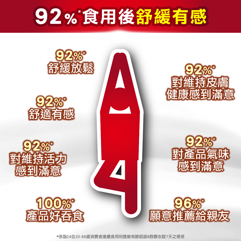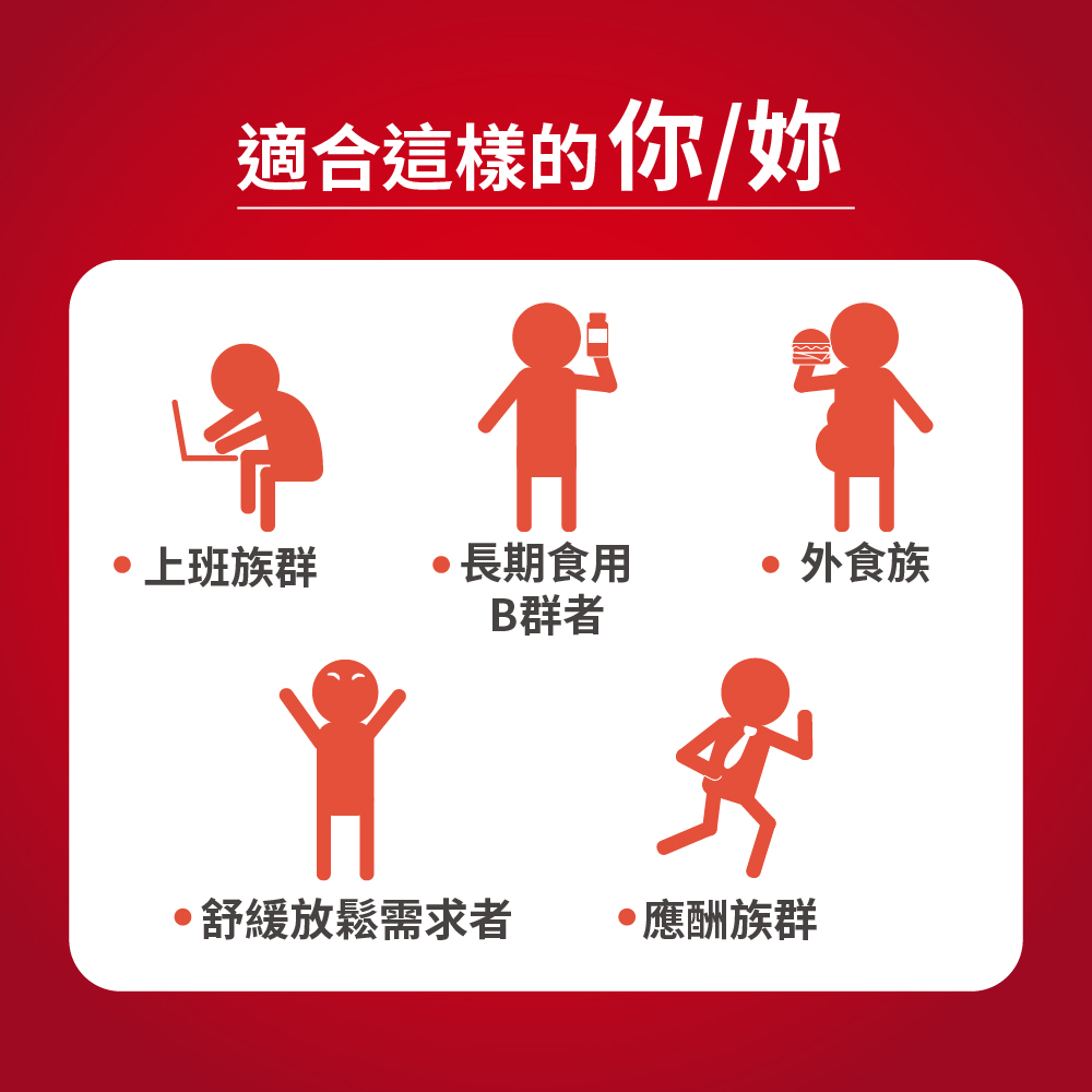 舒緩放鬆 複方B群成分維生素B1幫助維持皮膚、心臟及神經系統的正常功能B6.B12 增進神經系統的健康添加日本植萃精華r-穀維素,舒適放鬆 美國AES發酵物,幫助吸收及利用