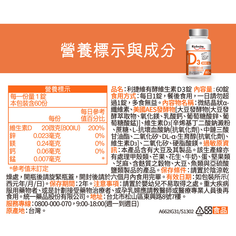維生素D3:維生素D3[辛烯基丁二酸鈉澱粉、蔗糖、L-抗壞血酸鈉(抗氧化劑)、中鏈三酸甘油酯、二氧化矽、生育醇(抗氧化劑)、維生素D3]、二氧化矽、硬脂酸鎂