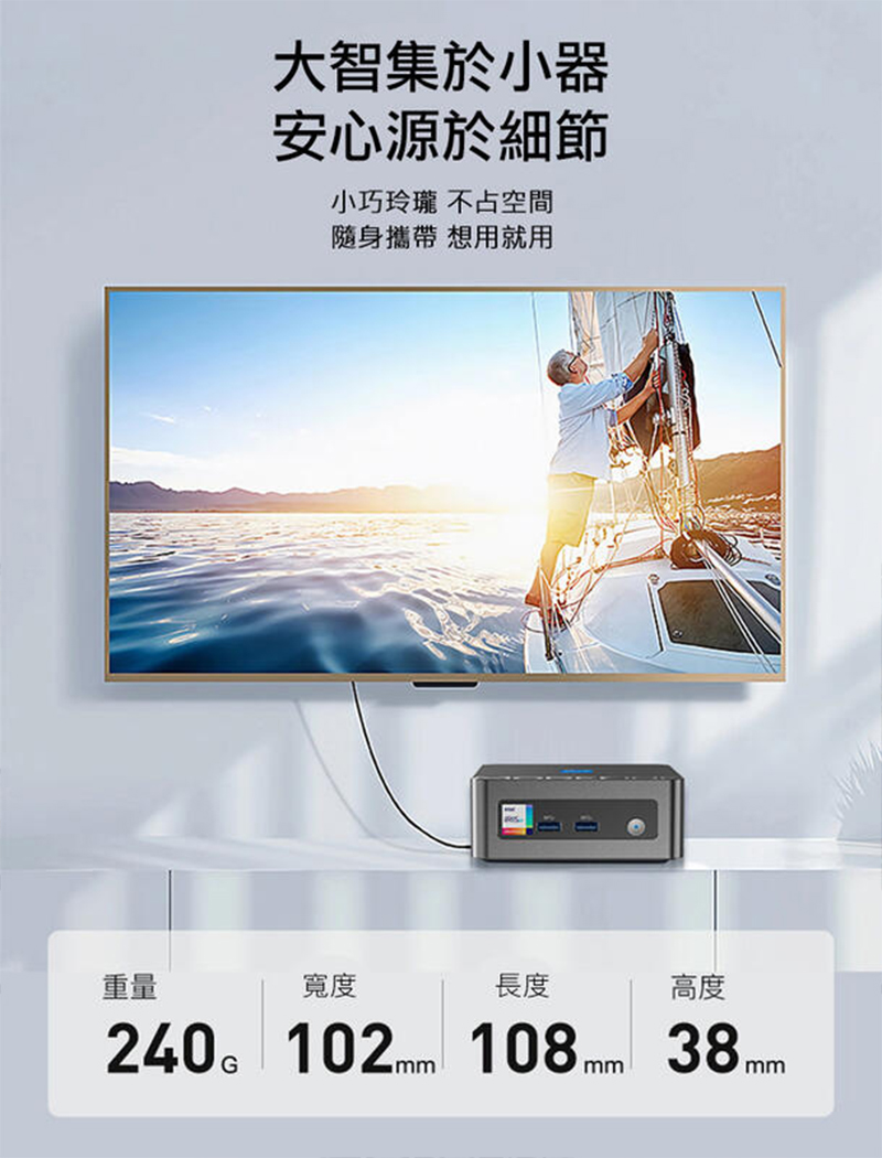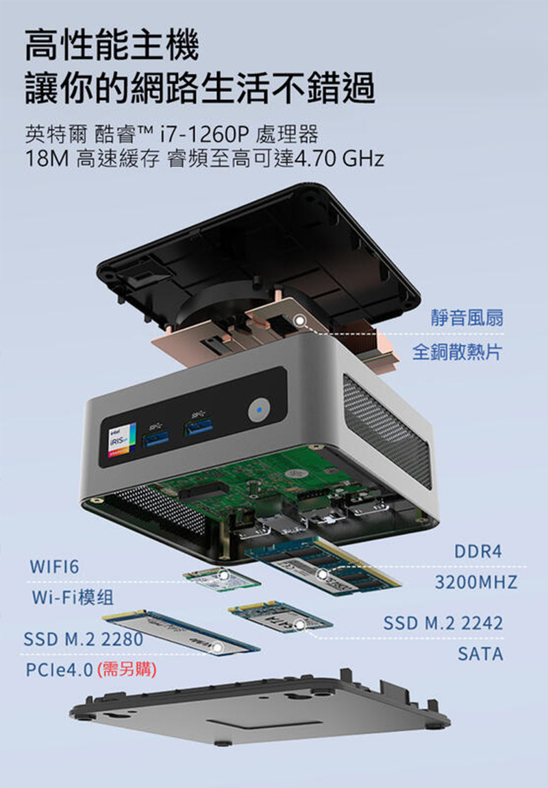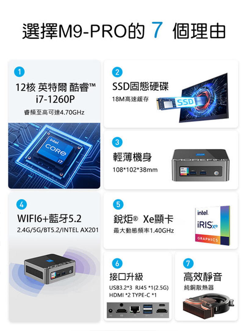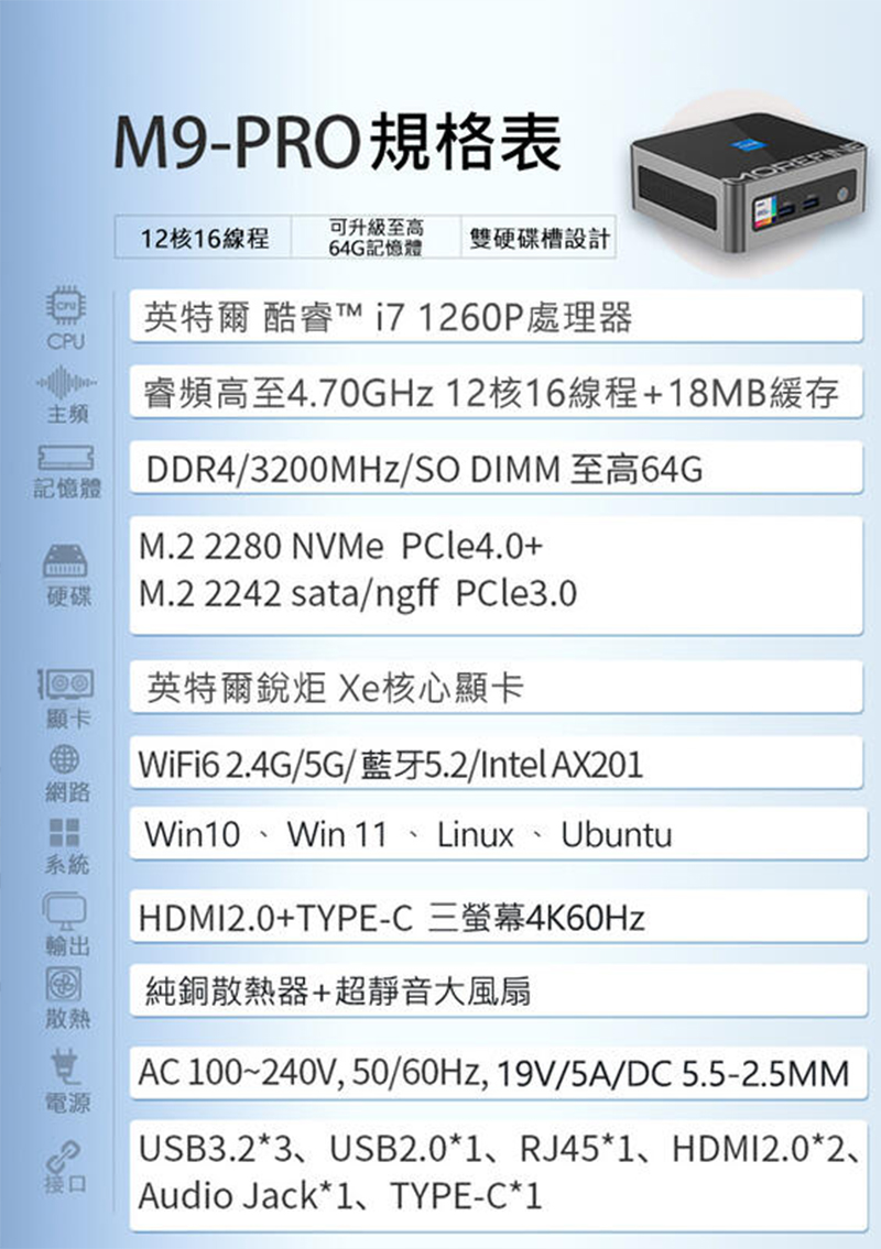 .內容物:M9 Pro 迷你電腦(Intel Core i7-1260P)*1、專用電源變壓器(100~240V)*1、HDMI線*1