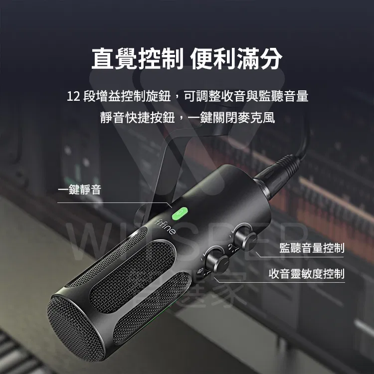 .12段增益控制旋鈕,可調整麥克風收音與監聽音量;一鍵靜音按鈕迅速關閉麥克風,節省操作不麻煩