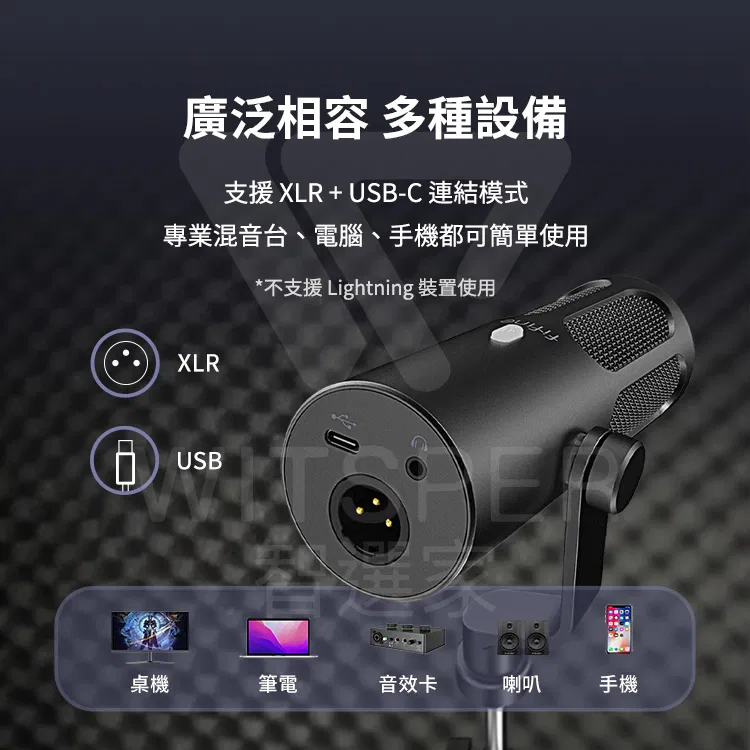.支援 XLR + USB-C 連結模式,專業混音台、電腦、手機輕鬆一插就能使用