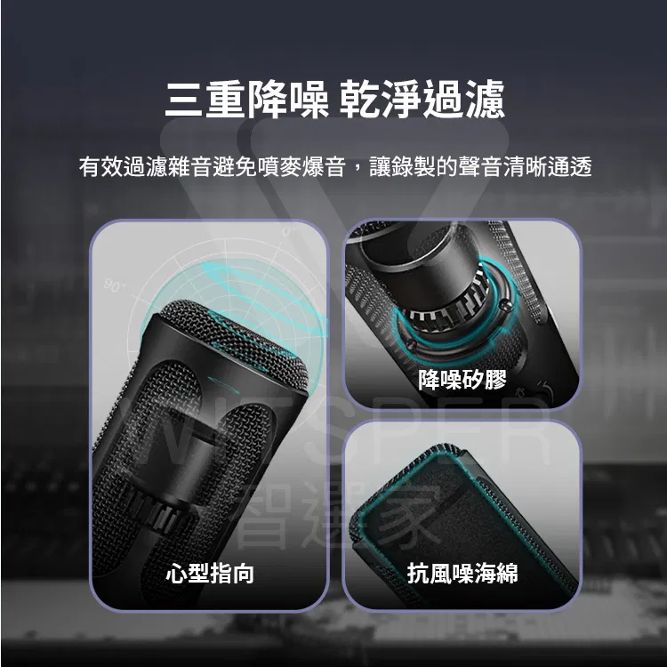 .麥克風內建降噪矽膠、抗風噪海綿,有效過濾雜音避免噴麥爆音,讓錄製的聲音清晰通透