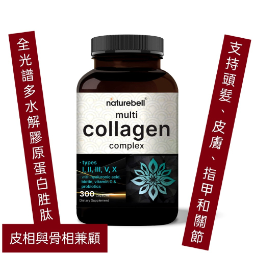 美國自然鐘NatureBell複合水解膠原蛋白(I、II、III、V、X 型)300 粒含益生菌透明質酸和生物素支持髮、皮膚、甲和關節