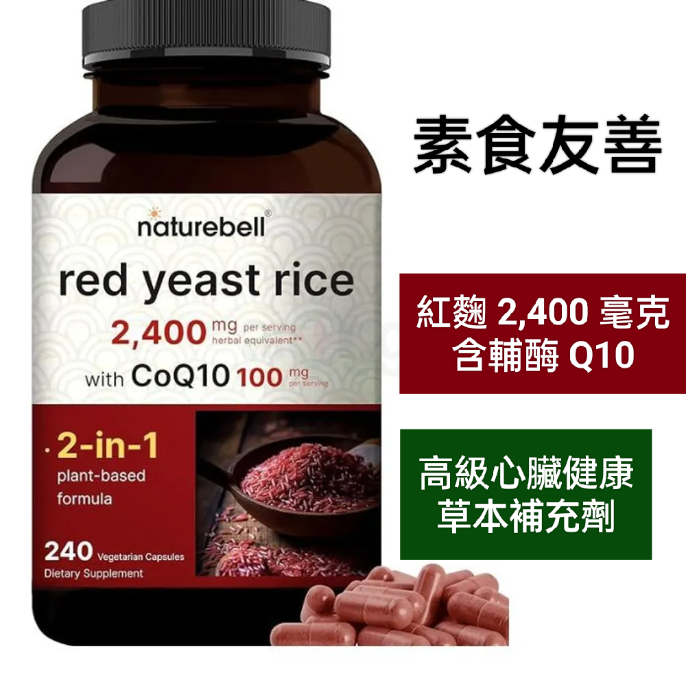 美國自然鐘NatureBell紅麴2400mg含輔酶Q10~高級心臟健康草本補充劑~能量 膽固醇~240粒素食非基改