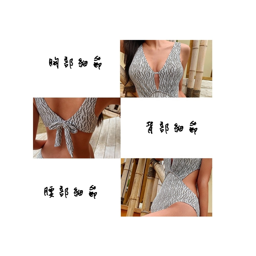 【A&R】歐美風圖騰深V側露後綁帶連身泳裝附防水手提袋 顏色隨機出