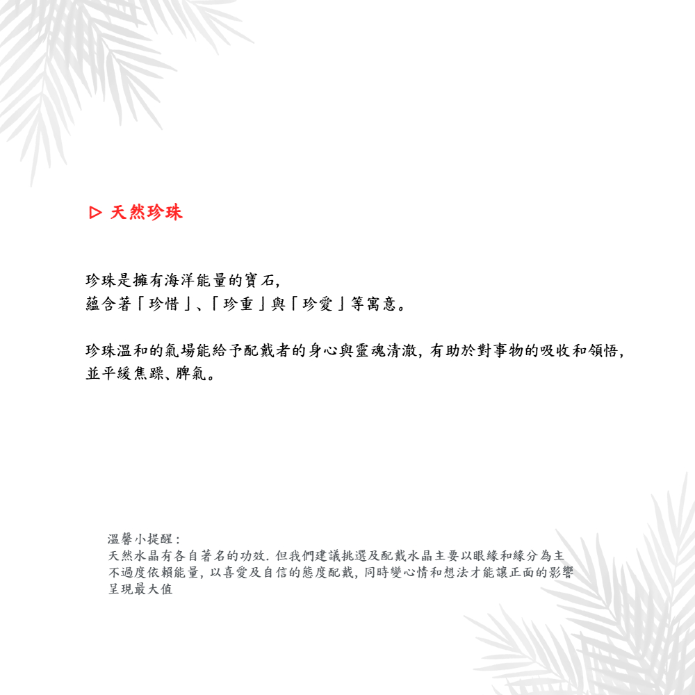 珍珠溫和的氣場能給予配戴者的身心與靈魂清澈,有助於對事物的吸收和領悟,並平緩焦躁、脾氣。