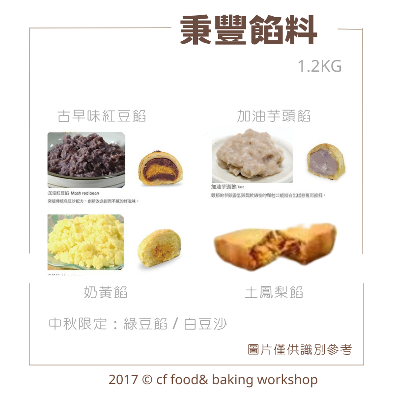 特色:獨家黃金比例熬煮成糕餅專用餡料,香味四溢,取代綠豆沙,口感更綿密,風味更佳。