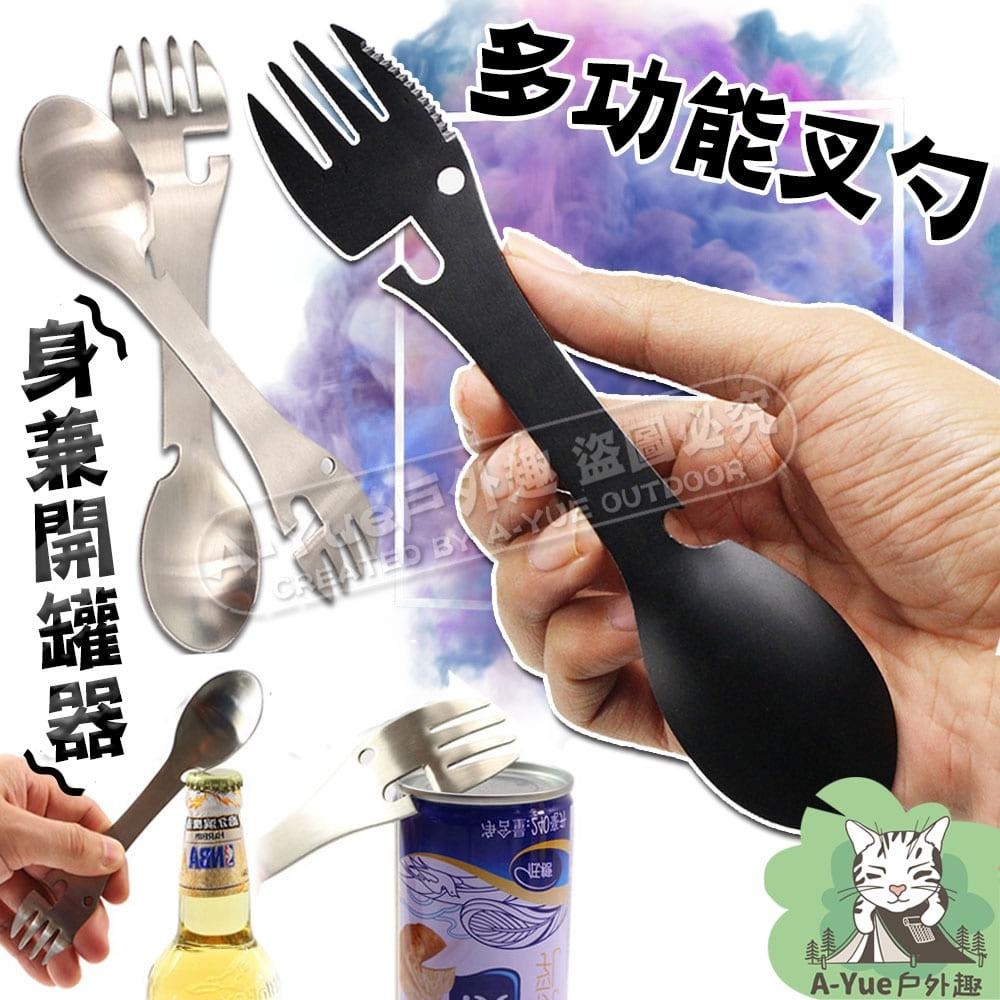 【A-Yue戶外趣】多功能刀叉 不鏽鋼餐具 刀叉 露營餐具 野炊 鍍鈦餐具 開罐器 開瓶器 湯匙 小刀 野營 輕量鈦湯匙