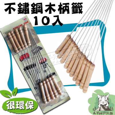 【A-Yue戶外趣】木柄環保籤10入 不鏽鋼籤 串肉鐵籤 烤肉鐵籤 取代竹籤 露營野炊 烤肉 燒烤 野炊 露營餐具 鐵叉