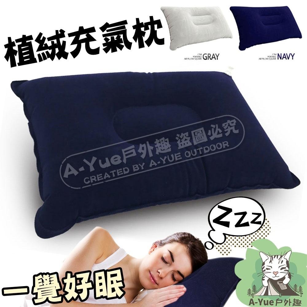 【A-Yue戶外趣】植絨充氣枕頭 睡袋 旅行枕 親膚枕頭 折疊 吹氣枕 露營寢具 車上 飛機枕 午休 旅行 腰靠枕 野營