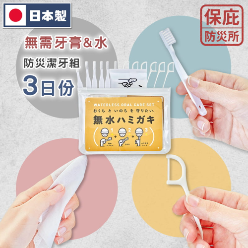 包裝內含早晚三日份牙刷、牙線、潔牙巾,使用過程不需要任何一滴水!