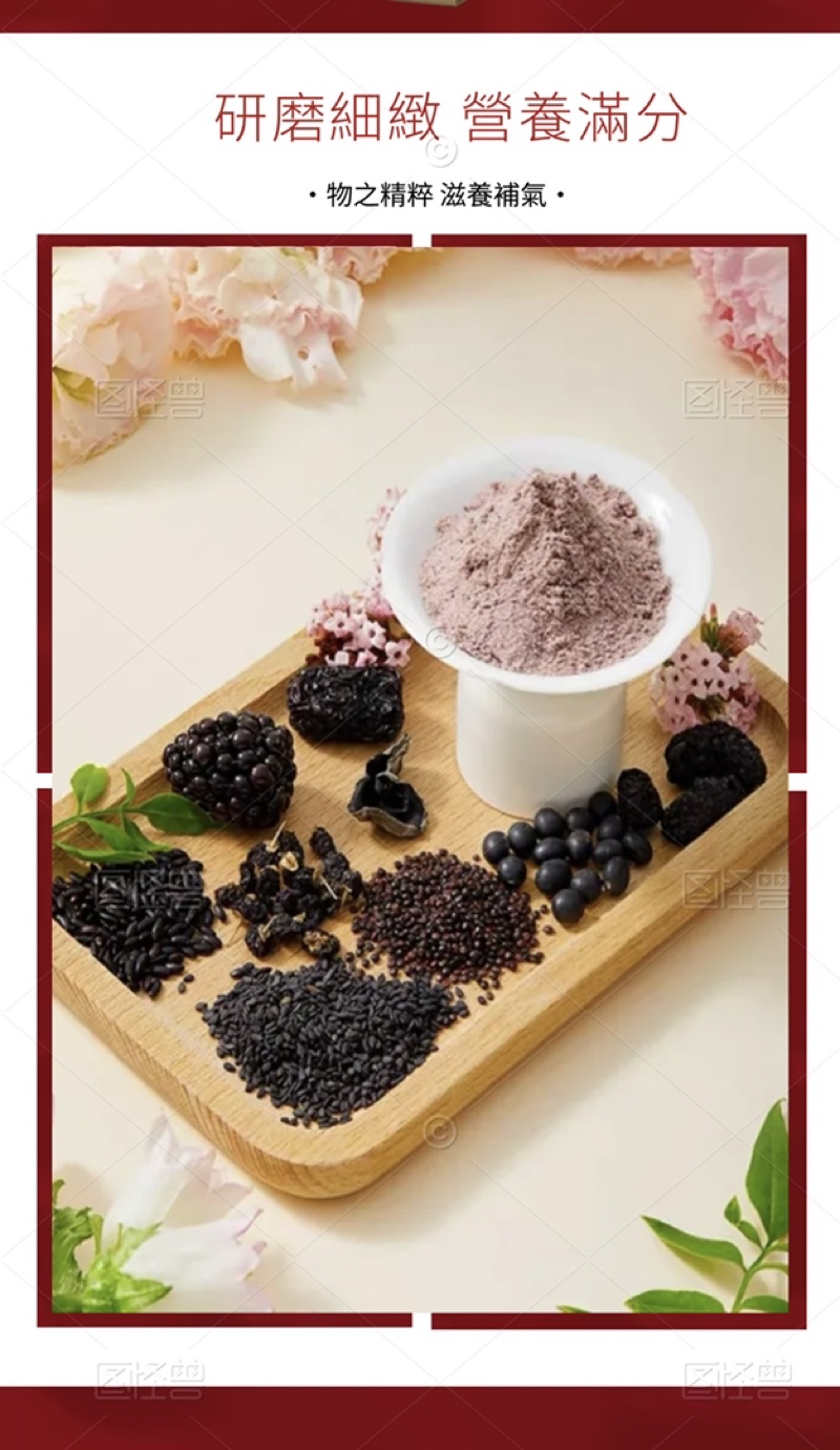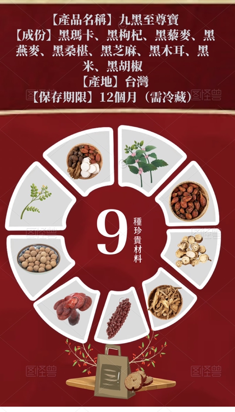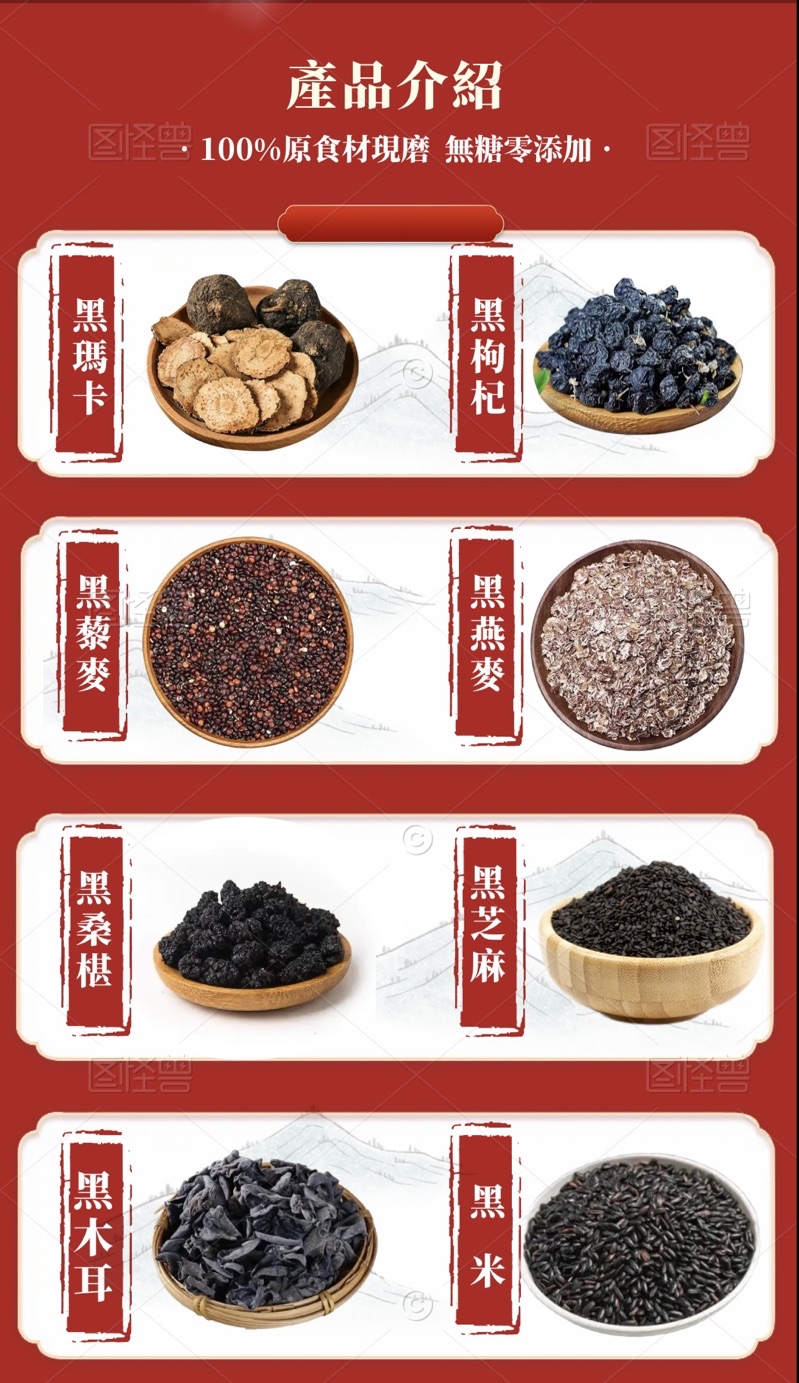 成 份:黑瑪卡、黑枸杞、黑藜麥、黑燕麥、黑桑椹、黑芝麻、黑木耳、黑米、黑胡椒