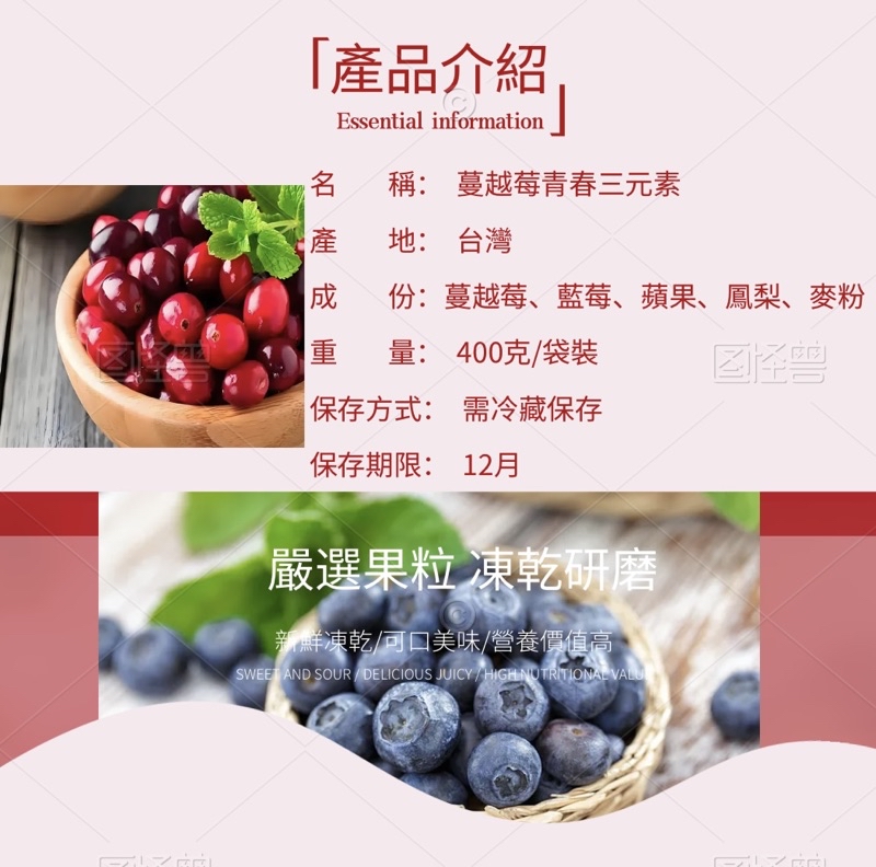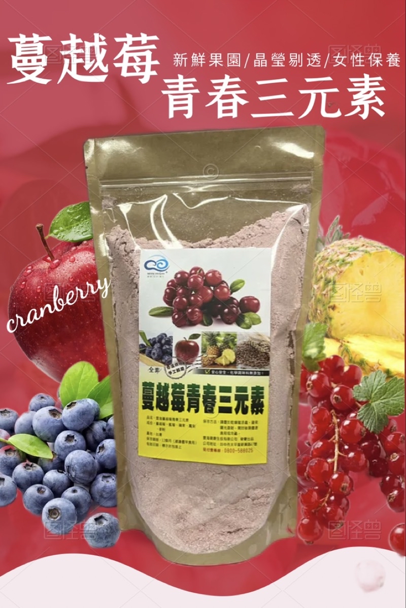 蔓越莓青春三元素是用蔓越莓、藍莓、蘋果、鳳梨、麥粉等水果食材等凍乾研磨製成。