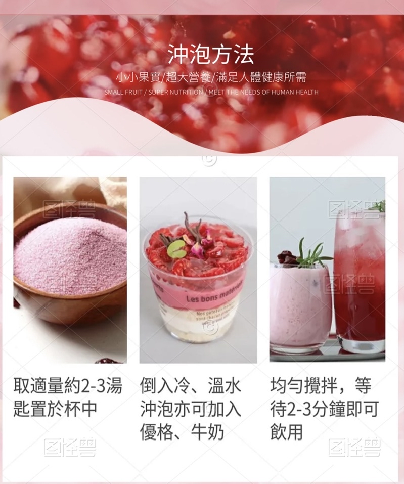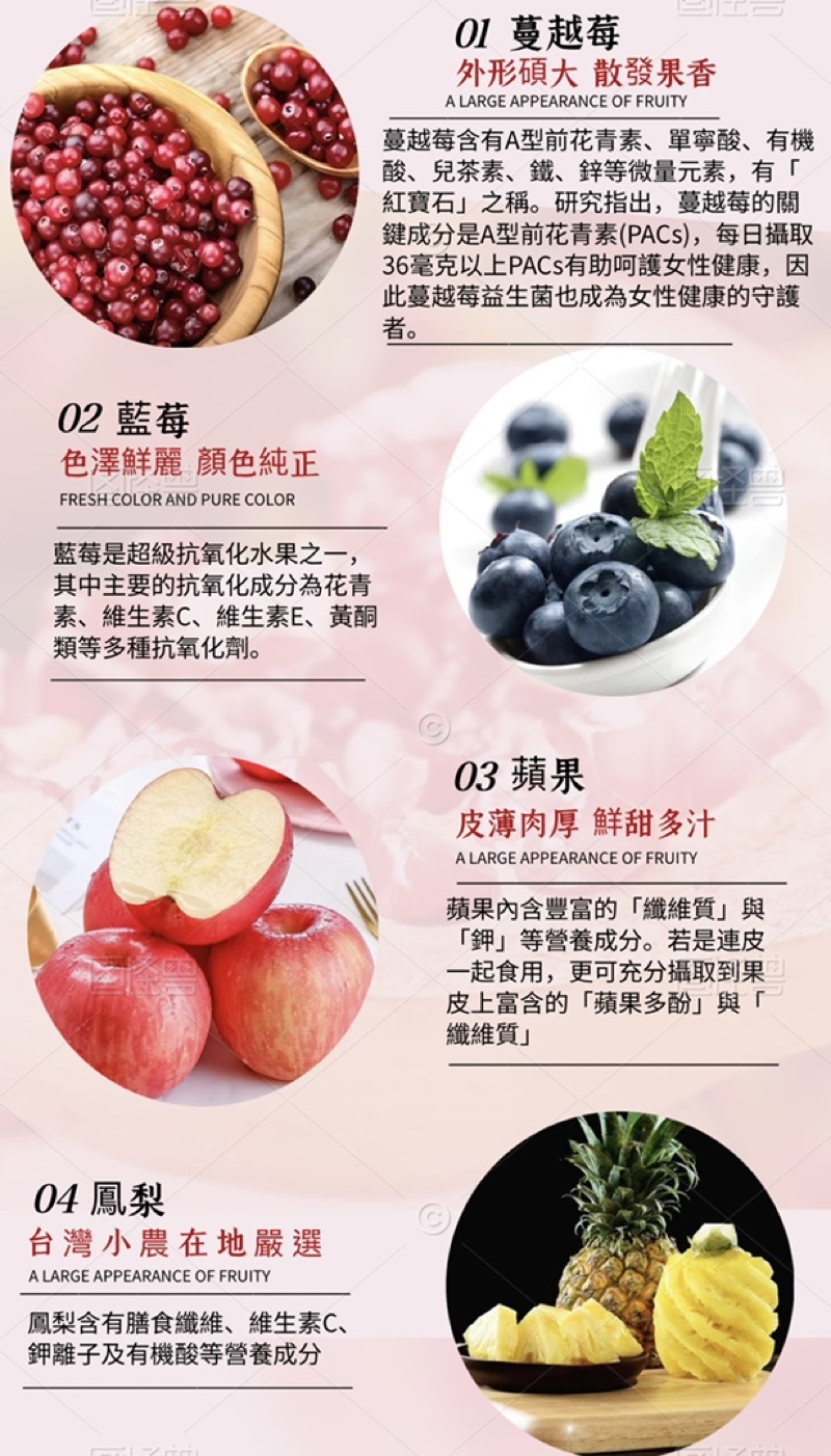 成 份:用蔓越莓、藍莓、蘋果、鳳梨、麥粉