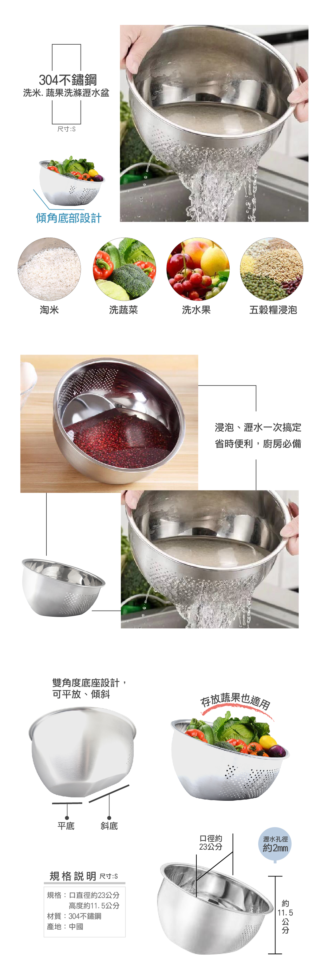 《艾克思》斜底304不鏽鋼洗米.蔬果洗滌瀝水盆_1入