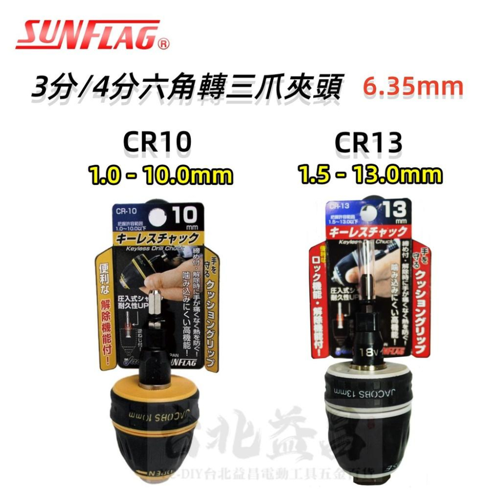 【台北益昌】日本 新龜 SUNFLAG 鑽夾頭 自動夾頭 3分 4分 六角轉三爪 CR10 CR13