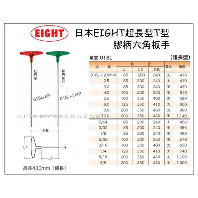 EIGHT 018L 強力 T型 膠柄 六角扳手 超長型 mm 英吋