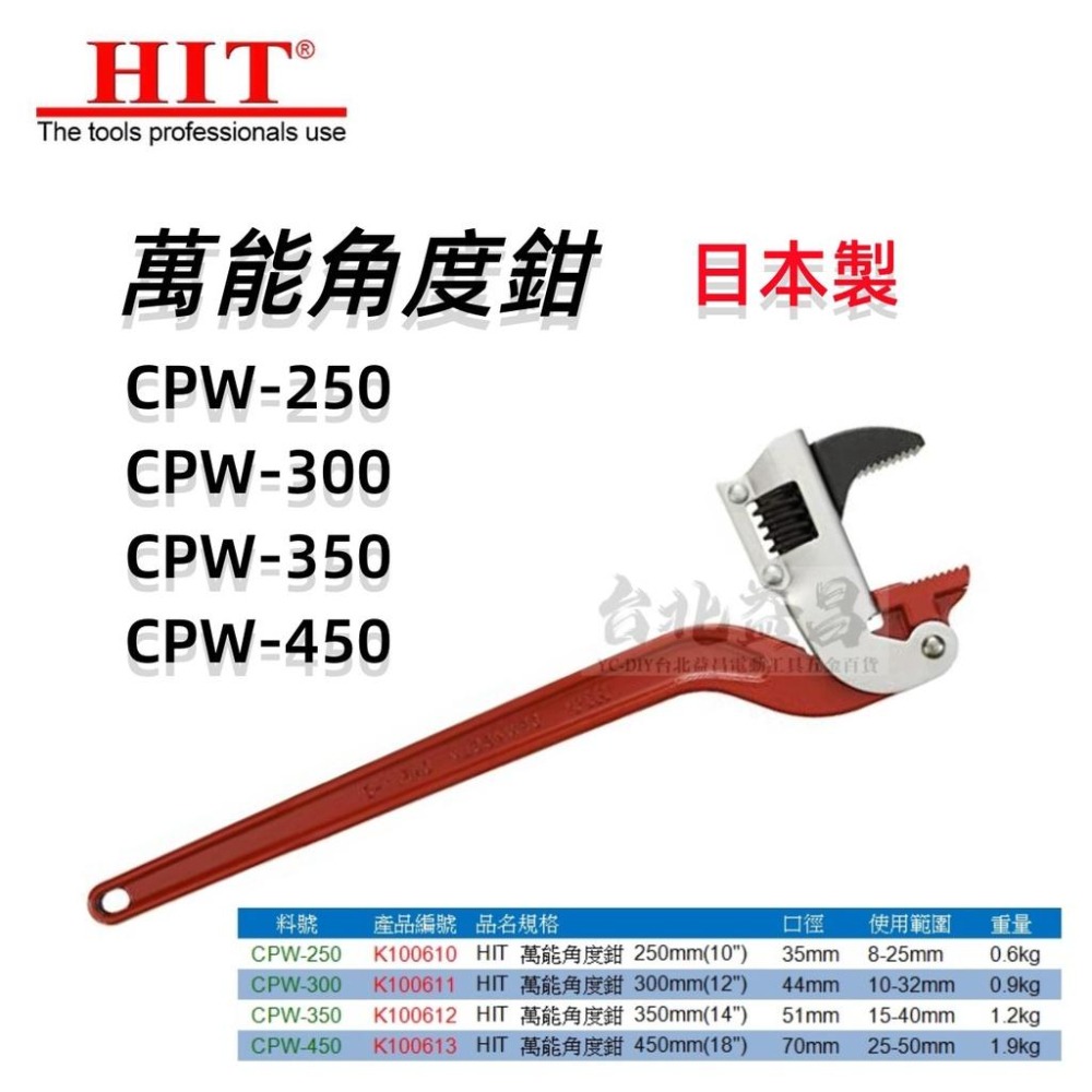 【台北益昌】日本 HIT CPW-250 CPW-300 CPW-350 CPW-450 萬能角度鉗 管子鉗