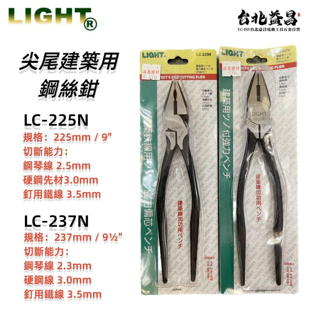 【台北益昌】鋼絲鉗 尖尾 鉗 尖尾建築用鋼絲鉗 LC-225N LC-237N 建築用 老虎鉗 省力鉗