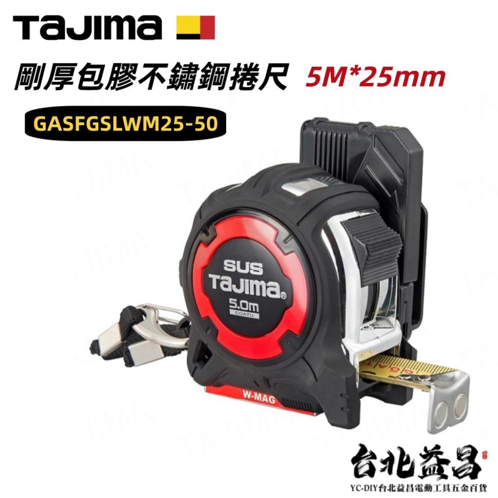 台北益昌 TAJIMA田島 剛厚包膠 不鏽鋼捲尺 5米x25mm/公分 附安全扣 W磁鐵GASFGSLWM25-50
