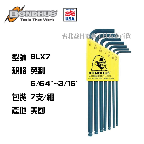 台北益昌 美國製 BONDHUS 10945 BLX7 英制 球型 六角 扳手組 7支組 5/64"~3/16" 公司貨