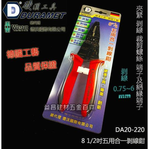 DURAMET 硬漢工具 德國工藝 DA20-220 8 1/2吋 五用合一剝線鉗 夾緊 剝線0.75~6mm 裁剪螺絲 端子 絕緣端子