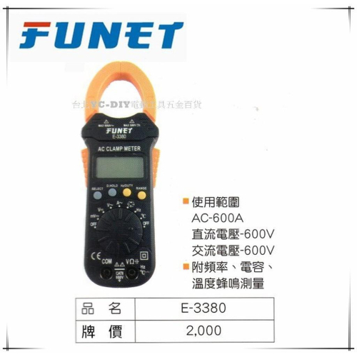 【台北益昌】FUNET 數字鉤錶 直流 交流測量 附頻率 電容 溫度蜂鳴測量 手持式 E-3380