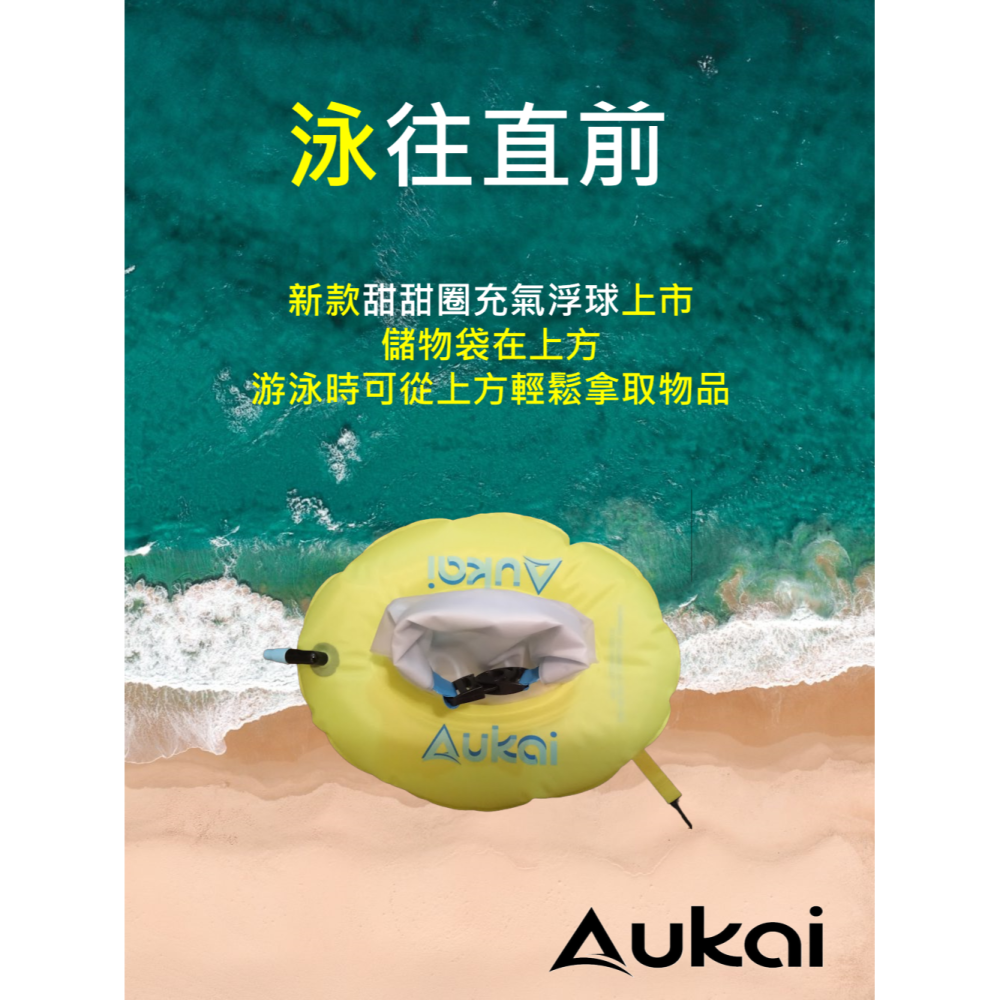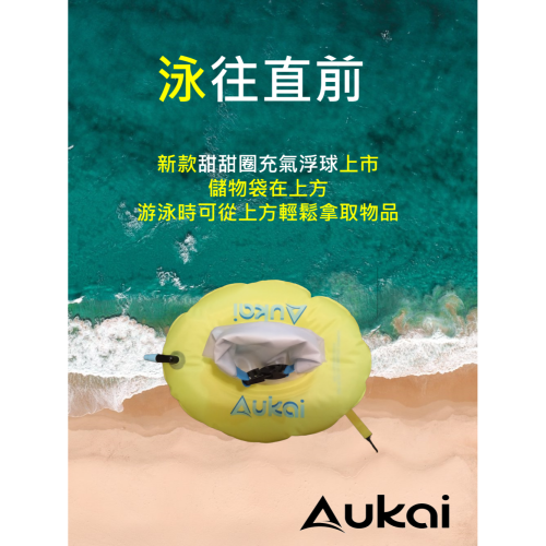 Aukai運動用品致力於提供高品質及機能性商品於游泳愛好者。Aukai過去以外銷OEM國際大廠為主,近年也開始開展國內市場。游泳浮球為Aukai團隊於1998年與美國國際游泳名人堂首先開發推出,相較於傳統魚雷浮標,充氣浮球使用輕巧方便,不影響泳姿,顏色鮮豔,容易被同行者或救生人員看到,並可於疲累或抽筋時稍事休息,大幅增加開放水域游泳安全。也可當儲物袋使用。台灣團隊設計開發,中國大陸生產製造。