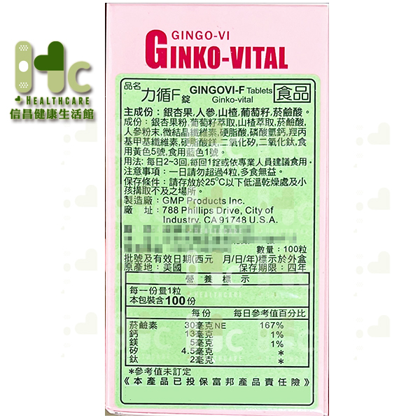 Ginko-Vital 力循F錠100粒(原:循福)~美國製造~