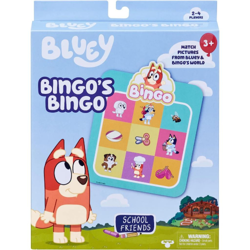 Bingo 賓果遊戲是一款有趣的配對遊戲,可搭配 Bluey 和 Bingo 世界的圖像。 包括 4 張雙面賓果卡、48 張賓果籌碼、12 張賓果記分籌碼和 36 張電話卡 第一個連續獲得三個籌碼的玩家,並大喊 BINGO 贏得了回合和一個計分籌碼。 贏得 3 個得分籌碼,就贏得了比賽! 適合 3 歲及以上的人,有趣而令人興奮的遊戲