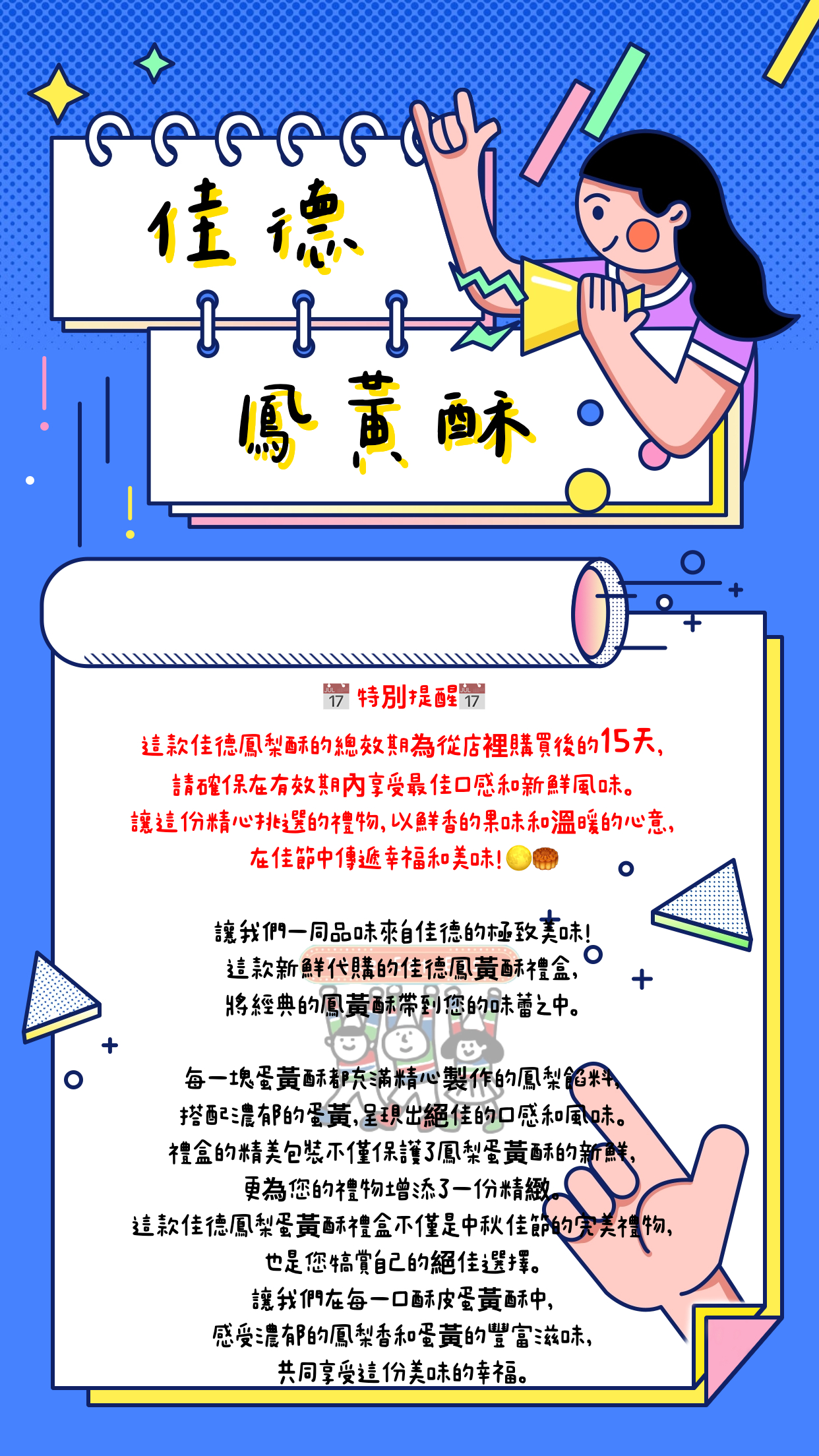 這款佳德鳳黃酥的總效期為從店裡購買後的15天,請確保在有效期內享受最佳口感和新鮮風味~