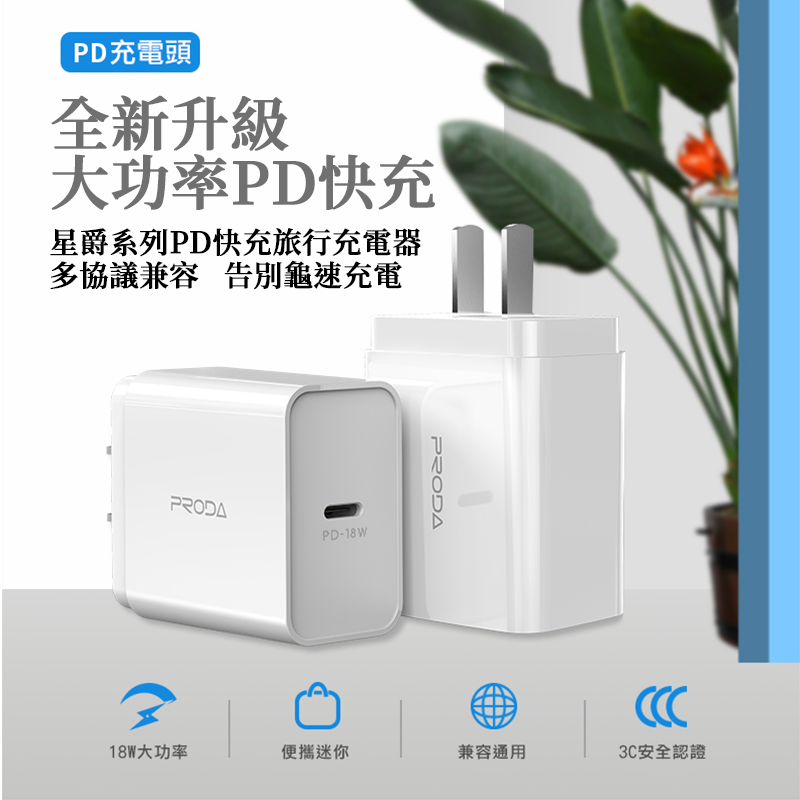 PRODA 星爵 18W PD快充充電器 PD-A16 Type-C快充頭 旅充插頭 USB-C充電器 18W大功率