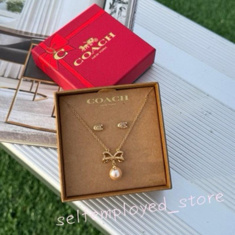 [S.E美國代購]COACH時尚飾品禮盒組 經典logo耳環+蝴蝶c字珍珠項鍊 金色 聖誕節限定禮盒 送禮