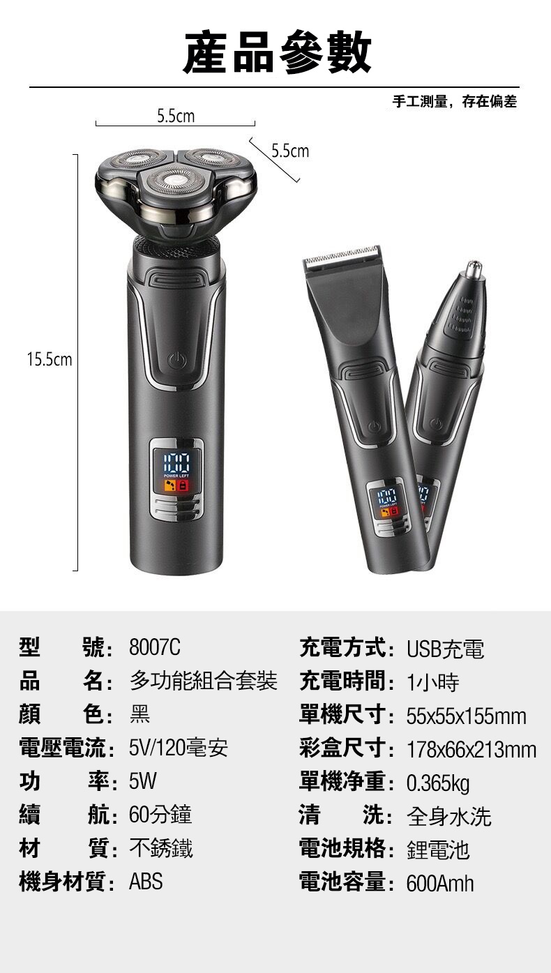 產品內容 : 刮鬍刀、鼻毛器、理發器、USB充電線、清潔刷、說明書