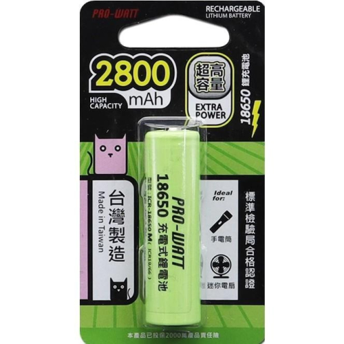 【現貨附發票】PRO-WATT 華志 18650 充電鋰電池 2800mAh (平頭) 1入 /卡 ICR-18650M