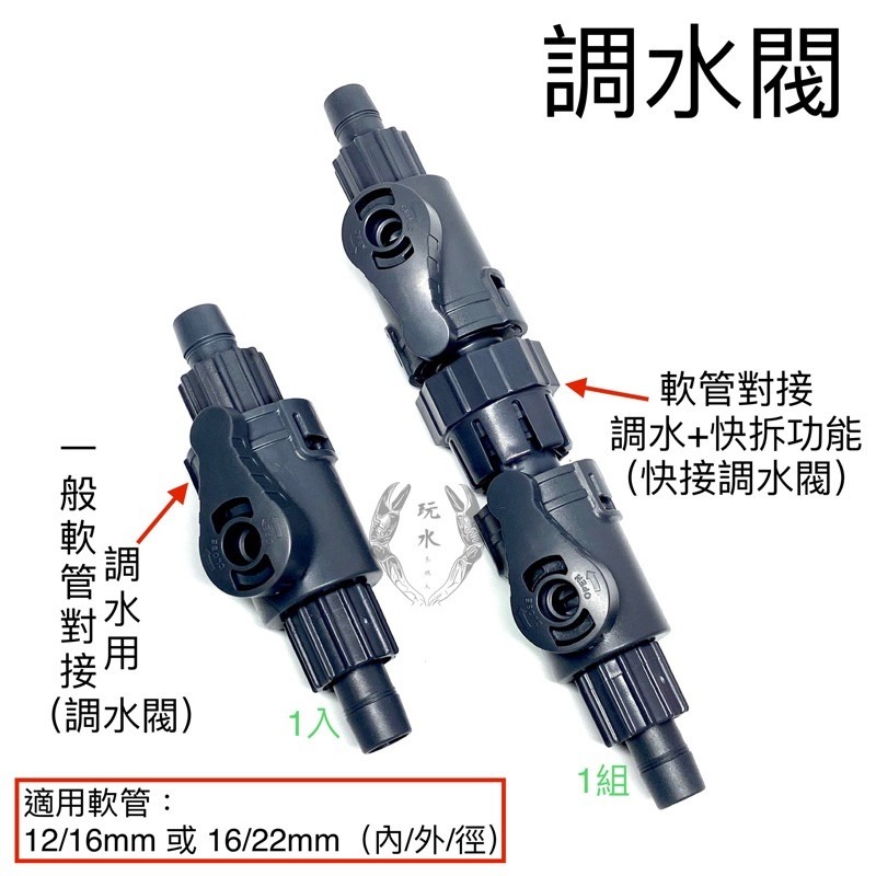 ⭕️快接調水閥: ● 適用各品牌外置式過濾桶、沉水馬達、水管轉接。 ● 直接串接於軟管上,不影響過濾桶及其他設備結構。 ● 高級工程用塑膠材料,耐衝擊,抗酸鹼。 ● 輕撥水量調節旋鈕便可微調水流大小。 ● 經轉迫緊螺帽即可分離上下接頭。 ● 鎖水設計,清理過濾器時可關閉閥門,保持地板清潔。