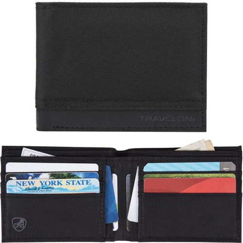 《TRAVELON》皮革拼接兩折短夾(黑) | 中夾錢包 短夾錢包 皮包 零錢包