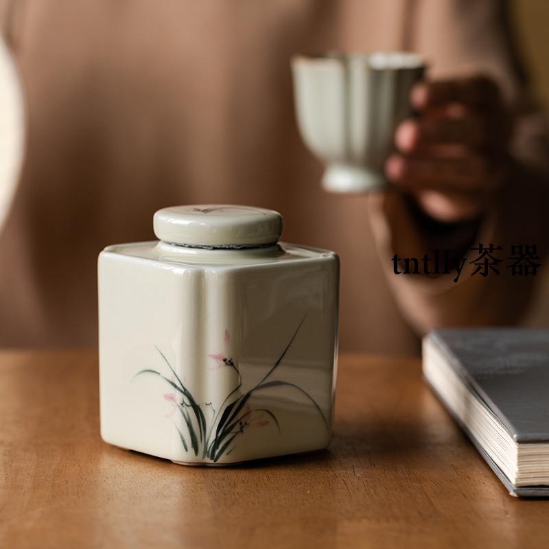 【現貨免運】草木灰手繪蘭花小號密封罐功夫茶具密封茶倉陶瓷儲茶罐 德化茶具