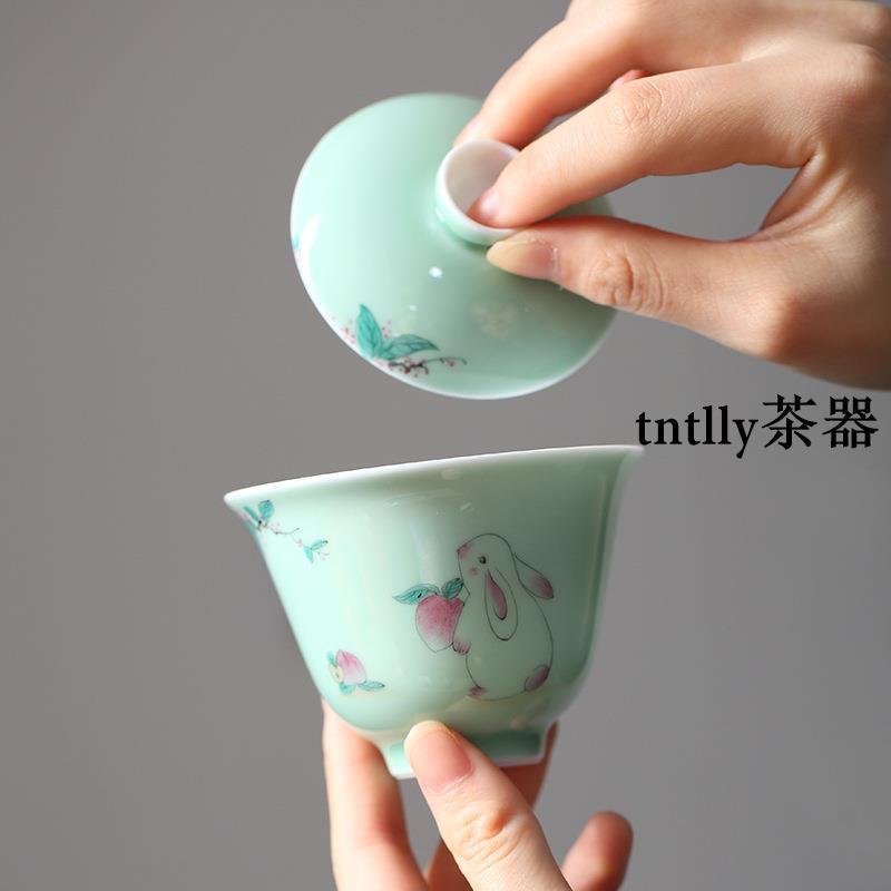 【現貨免運】青瓷全手繪蓋碗 可愛兔子吃蘿卜泡茶碗 陶瓷功夫茶具泡茶碗 德化茶具