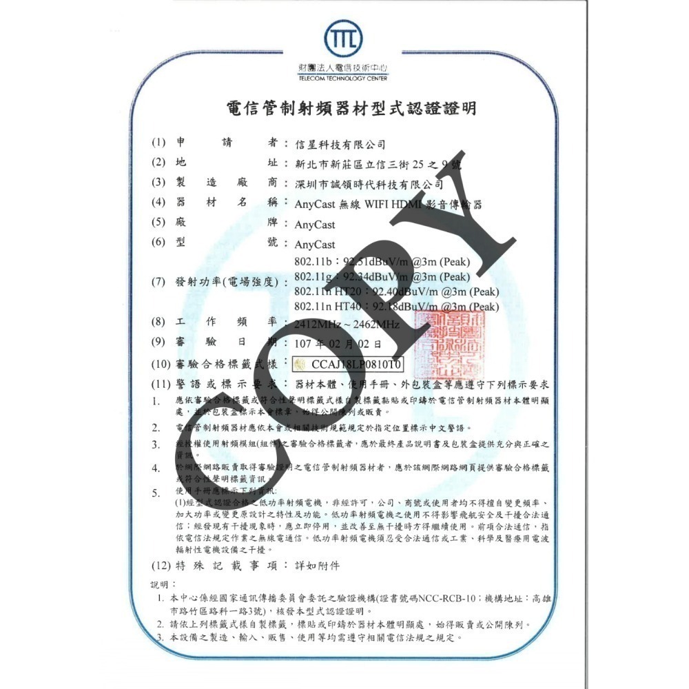 ✅產品型號:AnyCast、BSMI字號:T3C088、NCC字號:CCAJ18LP0810T0