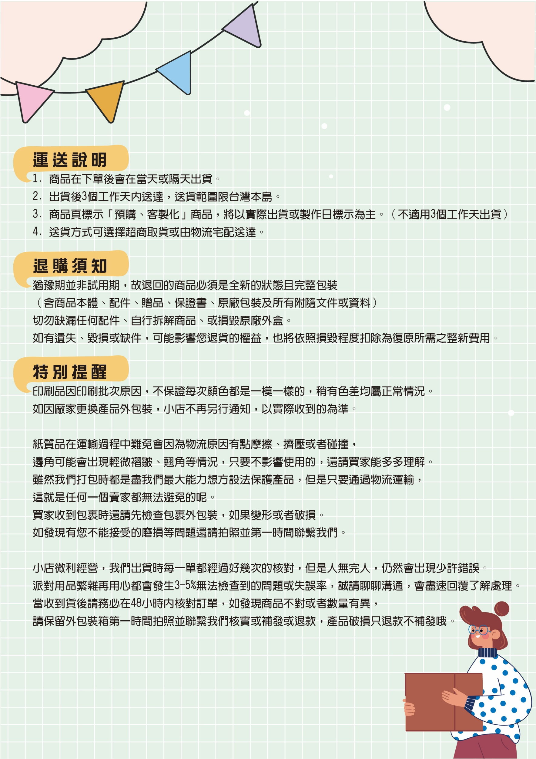 1.作工並非非常精細,且每批顏色會有些許差異,介意的買家請勿購買哦!