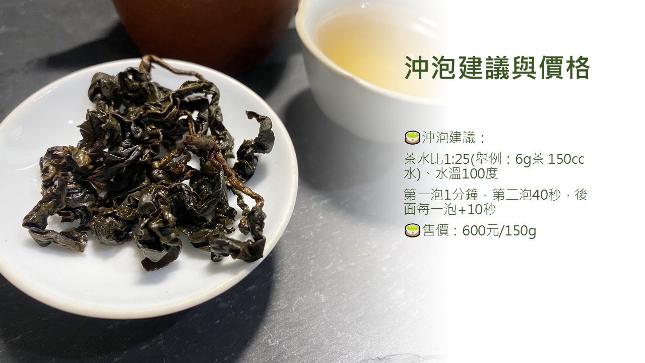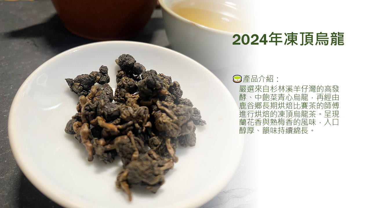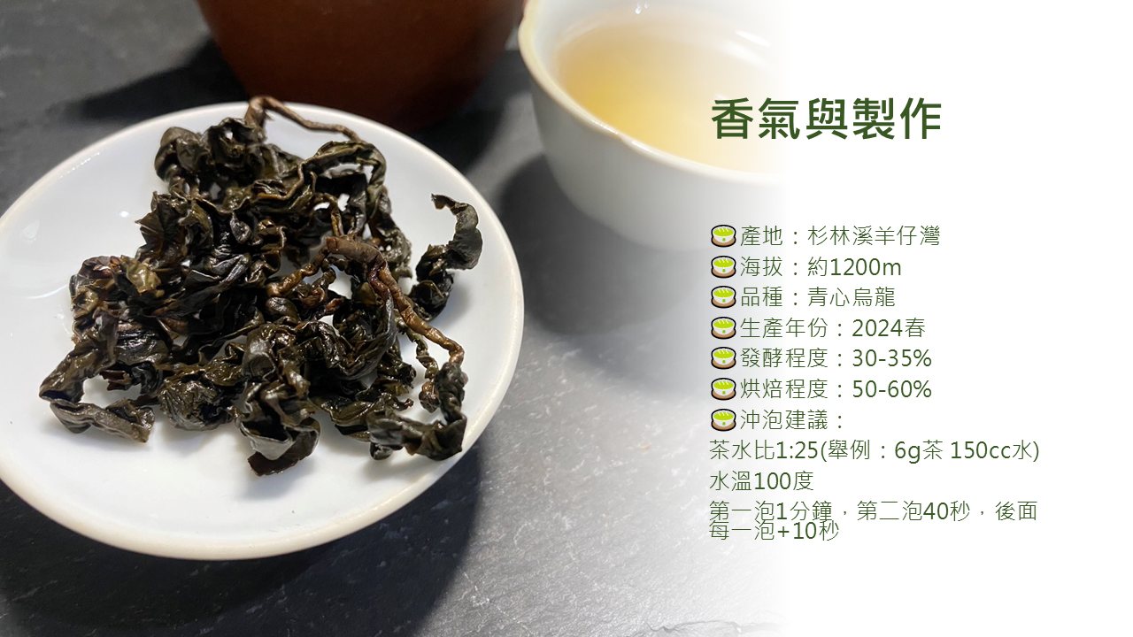嚴選來自杉林溪羊仔灣的高發酵、中飽菜青心烏龍,再經由鹿谷鄉長期烘焙比賽茶的師傅進行烘焙的凍頂烏龍茶。呈現蘭花香與熟梅香的風味,入口醇厚、韻味持續綿長。