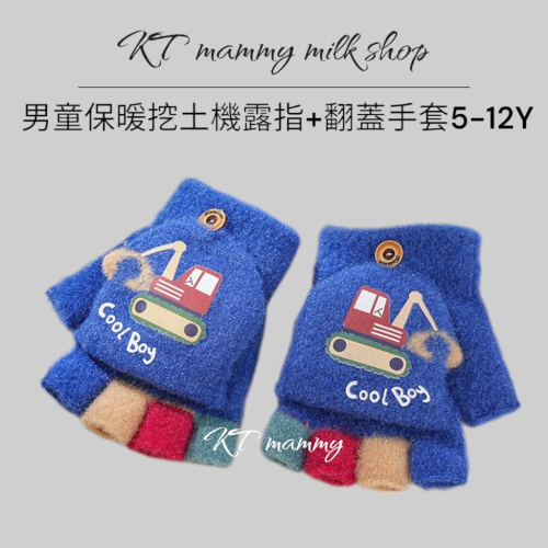 KT媽咪奶粉用品團購-現貨兒童手套,男童露指翻蓋手套,秋冬保暖手套,5-12歲男童挖土機手套,兒童翻蓋手套