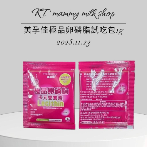 <美孕佳極品卵磷脂> 此為試吃包1g的賣場,如需正常品歡迎詢問 是專為孕婦和哺乳期女性設計的營養補充品,以其高純度卵磷脂和多重營養配方受到許多使用者的好評。  <產品特色> 1.高純度卵磷脂: 採用德國非基改卵磷脂,純度高達 97%,並富含磷脂膽鹼。 2.多元營養素: 除了卵磷脂,還添加了多種珍貴成分, 包括日本金絲燕窩萃取、初乳蛋白、珍珠粉、磷脂醯絲 胺酸(PS)等。 3.有助消化: 添加了日本專利的Fibersol-2可溶性膳食纖 維及果寡糖,有助於維持消化道機能順暢。 4.適口性佳: 採用草莓風味的細緻粉劑,方便直接食 用,口感好。 <適用對象>:專為懷孕期間和產後哺乳期的媽咪設計。 <主要功效> -幫助哺乳順暢: 卵磷脂能協助乳化,有助於母乳順暢排 出,是哺乳期媽咪的得力助手。 -提供孕期及產後營養: 配方中的初乳蛋白、燕窩萃取和 珍珠粉等成分,可補充多種營養素。 -調整體質: 內含的多元營養素有助於調整體質。 -維持好氣色: 燕窩和珍珠粉的添加,有助於哺乳媽咪維 持好氣色。