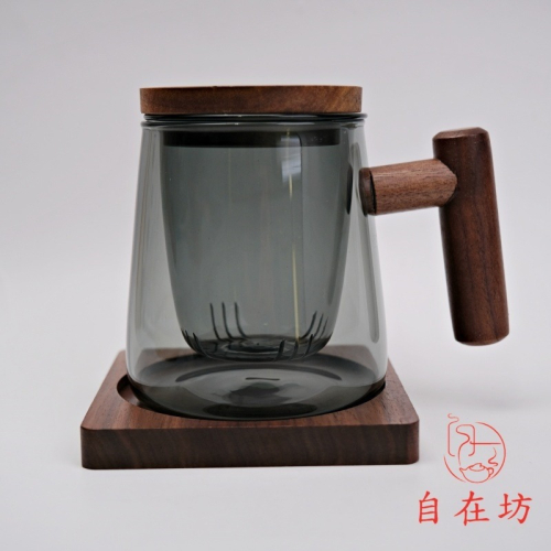 【全館滿599免運】辦公杯 泡茶杯 玻璃燻黑辦公杯─500ML 玻璃辦公杯 木柄手把 容量 另購杯墊【自在坊茶具】
